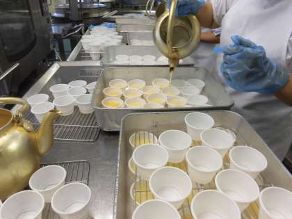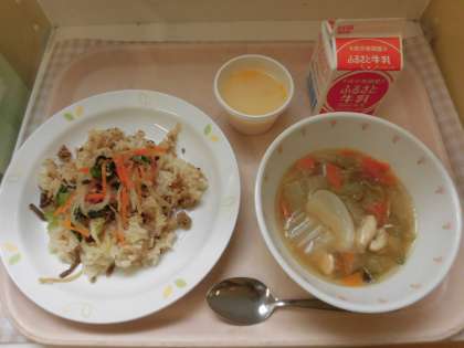 ☆今日の給食は、韓国料理で「ビビンバ」と「トック」です。ビビンバは韓国で「ピビンパプ」といい、混ぜごはんという意味があります。ごはんの上にのせる具材は、ナムルや炒めた肉、卵などをトッピングして、よく混ぜ合わせてから食べます。そして、デザートは、杏仁豆腐ゼリーでさっぱりと食べることができます。もちろん手作りです。1つ1つゼリー液をカップに入れました。