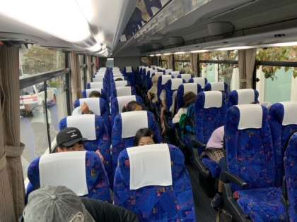 4年生は社会科見学で高尾山方面へ出かけます。小雨が降っています。高尾山付近は雨があがる予報ですので、今のところ登山の予定です。観光バスで出発しました。