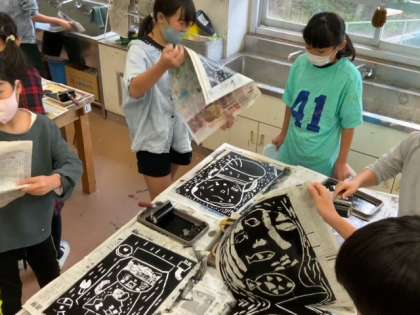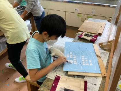 図工で木版画に取り組んでいます。彫る面と残す面を考えて彫り進めます。