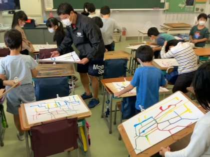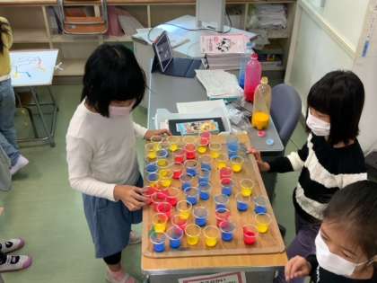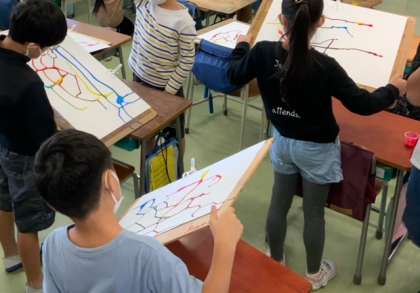 図工で、画用紙に絵の具を垂らし、画板ごと傾けて垂らした絵の具を移動させ、できた線や形を楽しみます。