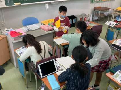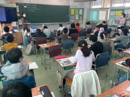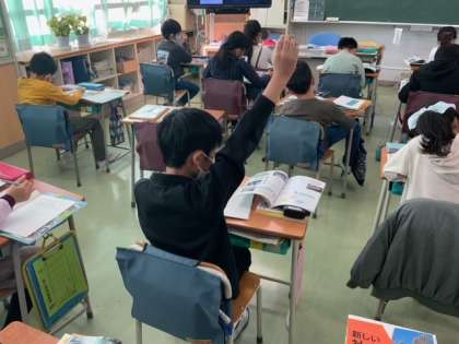 社会科は、自然災害から人々を守る単元です。この授業では、地域の人々は水害を防ぐためにはどのような取り組みをしているのかを調べていきます。友達と考えを交流しています。