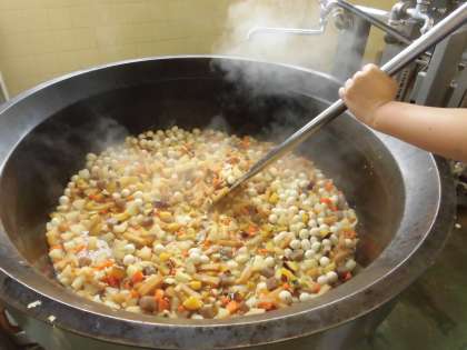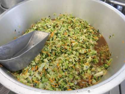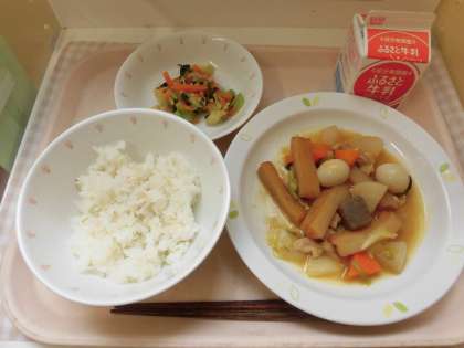 ☆今日の給食は、とり肉と大根のうま煮です。大根は一度下ゆでをして、味が染みこみやすいようにしました。そして、今が旬のさつも芉や白菜も入っています。
