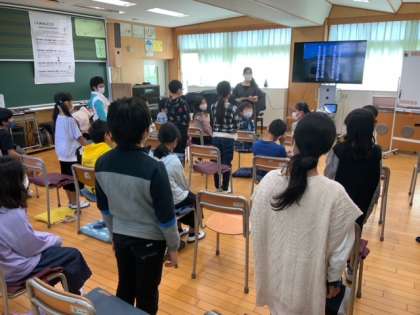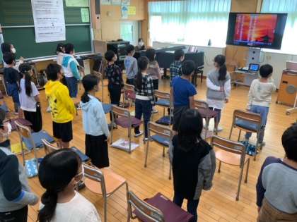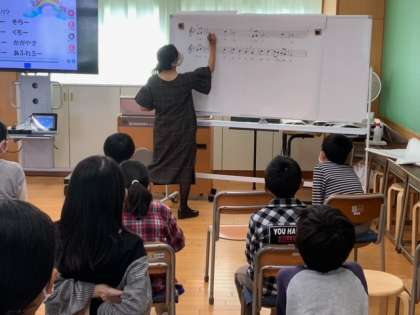 音楽室での音楽です。今月の歌「ゆうやけこやけ」を響きのある素敵な声で歌えています。新しい曲「パレードホッホー」では、アとイの旋律の特徴をたくさん感じて聞き取り、考えを交流させることができています。