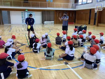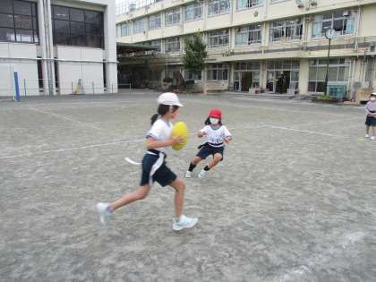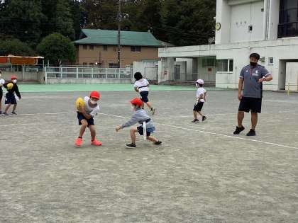 今日は、リコーフラッグスの方々にきていただき、タグラグビーを教えていただきました。