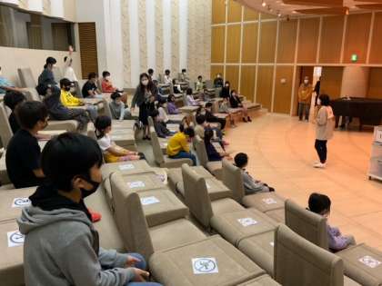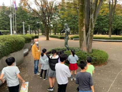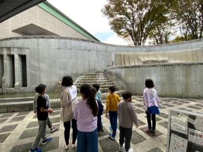 鑑賞リーダーの方が各グループに入ってくださり、世田谷美術館の外もみて回りました。ホールはクラスごとに入り、振り返りをしています。