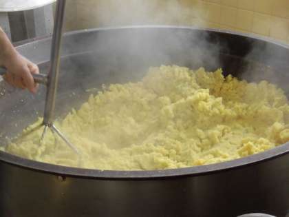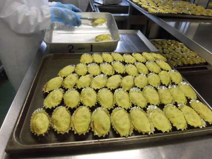 ☆今日のデザートは、スイートポテトです。今日は、給食室で、たくさんのさつまいもの皮をむいて、茹でてつぶし熱いうちに、砂糖、バター、牛乳、スキムミルクを混ぜました。さつまいも生地を1つ1つアルミカップに入れて表面に卵をぬりオーブンで焼いています。