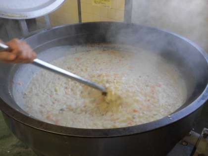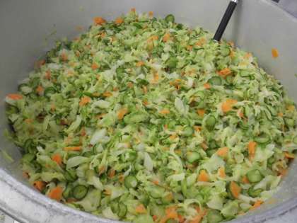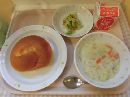 ☆今日の給食は、サーモンビーンズシチューです。今日は、秋鮭をつかってのシチューです。角切の鮭を使用し1度オーブンで焼いて、シチューの中に入れました。
