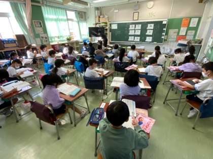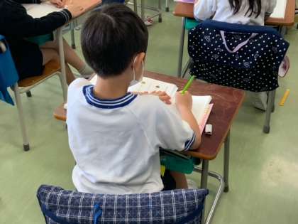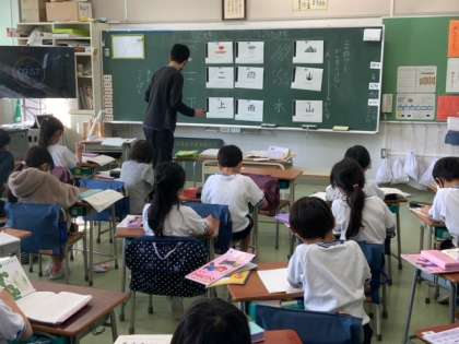 国語の漢字です。象形文字である「山」「雨」や指示文字である「上」などを学んでいます。