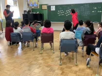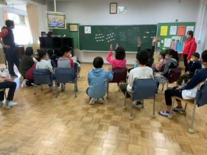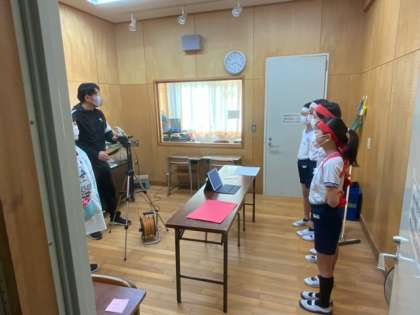 テレビ放送での応援練習です。赤白の応援団長がとキビキビと指示を出して練習が進められています。つくし学級でも赤白に分かれて座って応援練習です。運動会に向けて一気に雰囲気が盛り上がってきました。