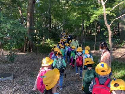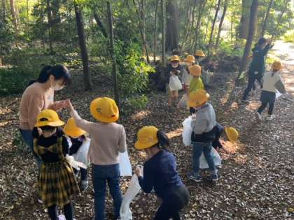 白百合女子大学でどんぐり拾いや学生の皆さんと交流を行います。大学の敷地に入った途端に緑がたくさんの空間に早変わりです。子どもたちは、どんぐりや虫、色付いた葉をたくさん見付けています。