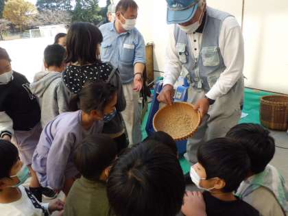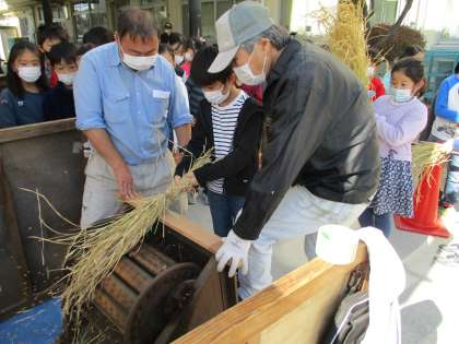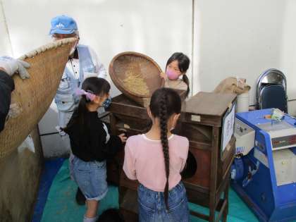 今日は、上祖師谷郷土研究会のゲストティーチャーから昔の道具(足踏み脱穀機、唐箕)の使い方を教わりながら、脱穀体験をしました。実際に体験してみると、道具の仕組みに様々な工夫がされていて、子どもたちは昔の人の知恵に驚いていました。最後にもみすり機を使って、みんなが育てたお米が玄米に変わりました。