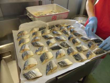 ☆今日の給食は、さばの塩焼きです。さばの匂い消しに酒をまぶし、塩を振ってオーブンで焼きました。そして、ごまをたくさん使用し野菜に和えたサラダも完成です。