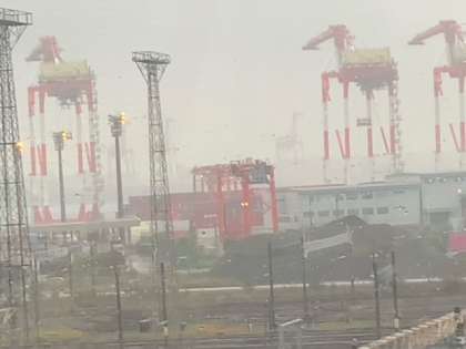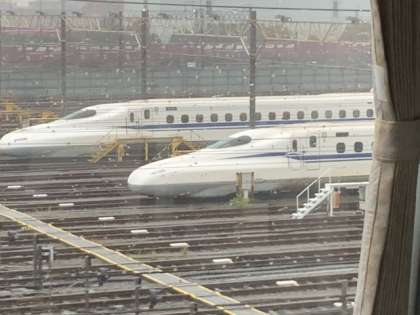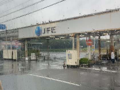 車窓から大きなクレーンや新幹線の車両基地が見えました。予定よりやや遅れてJFEに到着しました。雨が比較的強く降っています。