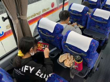 川崎マリエンに到着しました。雨が降っているので、展望台に向かうグループとお弁当を食べるグループに分かれました。バスの中でしっかり黙食ができています。
