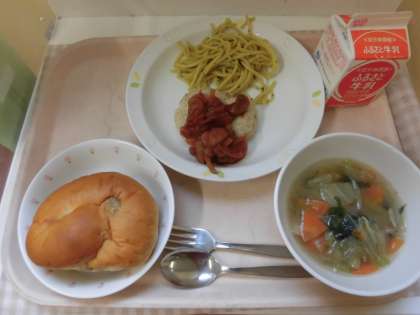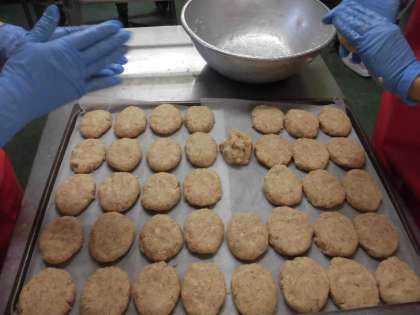 ☆今日の給食は、ヘルシーハンバーグです。子ども達の栄養を考えて、ハンバーグ生地にたくさんのおからを入れて作りました。調理員さん達が心をこめて1つ1つ丸めたものを、オーブンで焼いています。