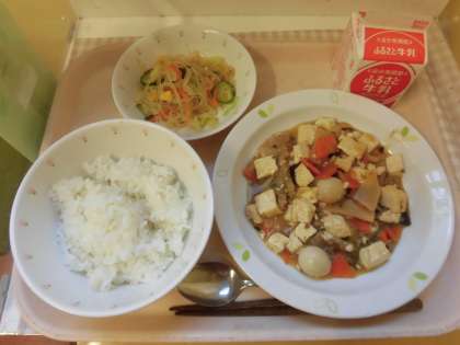 ☆今日の給食は、家常豆腐(ジャージャンドウフ)です。家常豆腐とは中国四川省といって中国の西にある地域の家庭料理です。家で常に食べる豆腐料理ということから、この名前がついたと言われています。味も濃いめに作ったので、ごはんにとてもあう1品ができました。