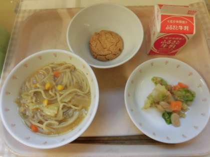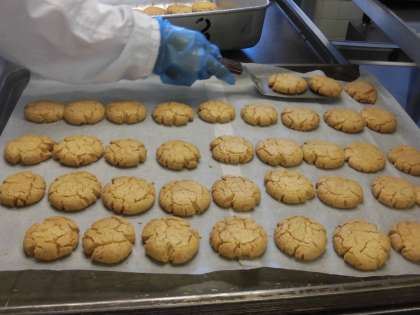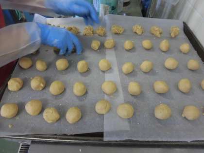 ☆今日のデザートは、ちんすこうです。ちんすこうの材料は、本来は小麦粉、砂糖、ラード(豚の脂)を使っていますが、今日はラードの代わりにひまわり油とショートニングという油を使いました。給食室で1つ1つ手作りし、オーブンで焼いています。