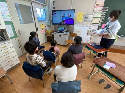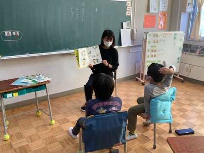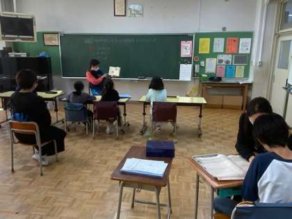 運動会の交流と合わせた形でのグループ学習です。国語の学習をしています。