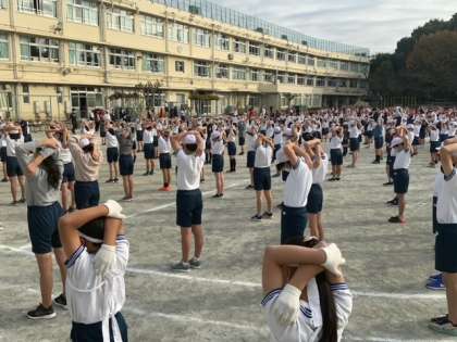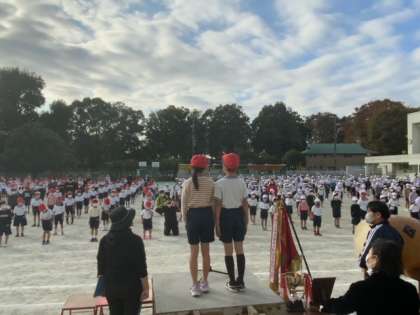 全校練習の2回目です。開閉会式と応援練習を中心に行います。とてもいい姿勢で整列できています。他にも体操や運動会のスローガンを声を合わせて言いました。