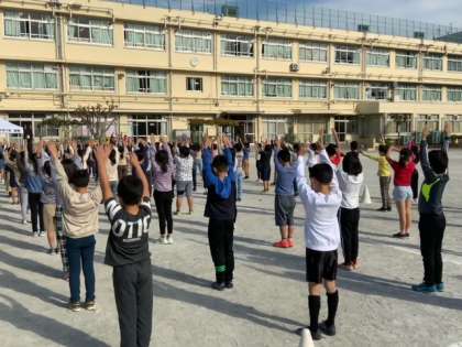 ラジオ体操も確認を兼ねて行います。団体競技は、入退場を含めて丁寧に確認しています。