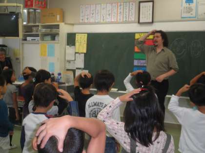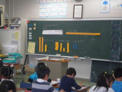 1年1組では、タイルを使って、算数の学習をしていました。1年2組は、ALTの英語の授業ですで、英語の先生と一緒に楽しく学習していました。