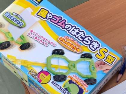 理科の学習でどうすれば車のおもちゃをもっと遠くまで走らせることができるかを予想しています。
