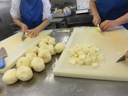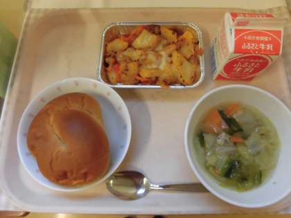 ☆今日の給食はポテトグラタンです。給食室でたくさんのじゃがいもの皮をむいて調理しました。子ども達が食べやすいようにケチャップで味付けをし、チーズをのせてオーブンで焼きました。