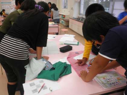 5年生は、ミニランチョンマットとミニ巾着を刺し子で作成中です。