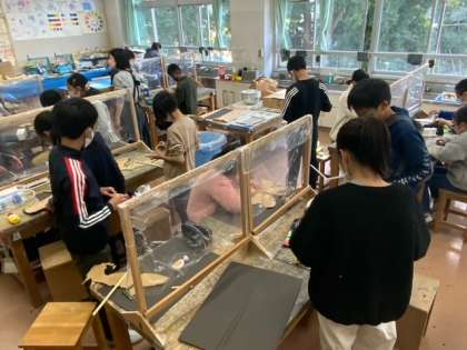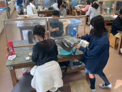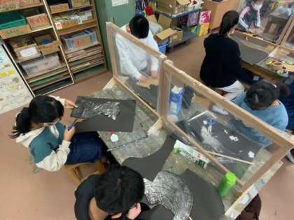 図工でメタリックアートの仕上げをします。磨いてまるで金属のように仕上げ、裏に黒い紙を貼って完成です。