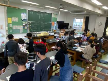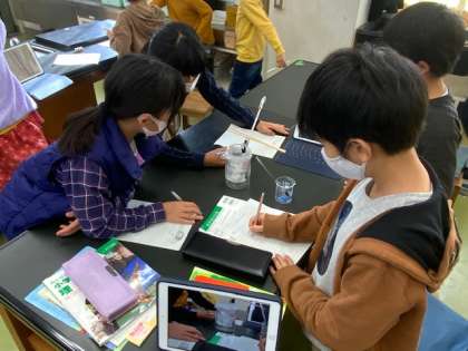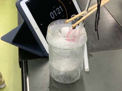 理科で水を冷やして凍る時の温度やその時の様子がどのように変化していくのかを観察しています。様子をタブレットでも撮影しています。