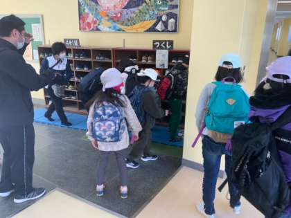 つくし学級で「まちたんけん」に出かけていました。学校の周囲で気に入る場所を探しました。給田第4公園や千歳烏山駅、オオゼキなどの気に入った場所を見つけられました。写真は、12時半頃学校に頑張って歩いて来て、到着したときの様子です。