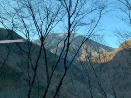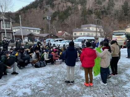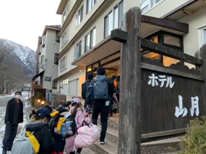 ホテル山月に到着しました。地面には雪が残っています。寒くて硫黄の匂いがします。猿を見つけた子どももいました。