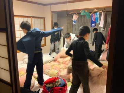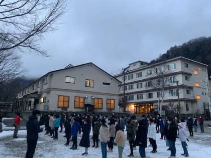 気温は−3℃、天気は曇りです。布団を片付けてホテル前の駐車場に向かい朝会です。5分前行動が随分とよくできて来ています。