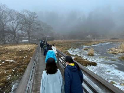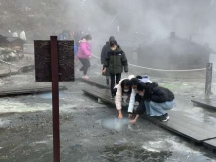 宿舎に荷物を置いて歩いて数分の源泉に行きました。霧と源泉の湯気で辺は幻想的です。硫黄臭が一段とします。