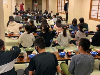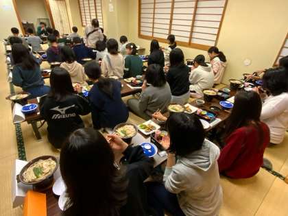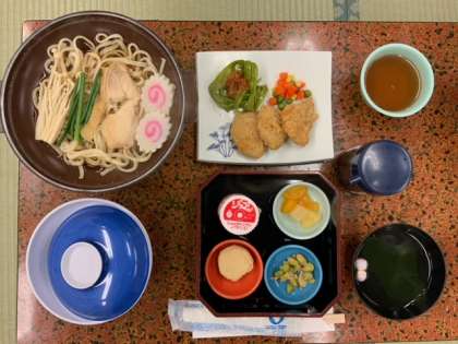 「ハイキングで疲れた身体に栄養満点の食事をしっかり食べましょう。」と食事当番さんのお話しがありました。オレンジの食器には、日光名物の湯波もあります。