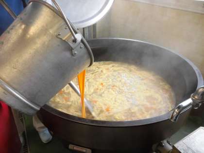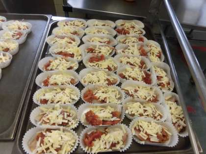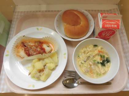 ☆今日の給食は「ホキのピザ風」です。ホキという魚に給食室お手製のピザソースとチーズをかけて、オーブンで焼きました。それに加えて、子ども達の好きなジャーマンポテトでした。