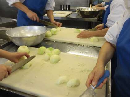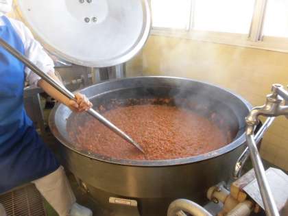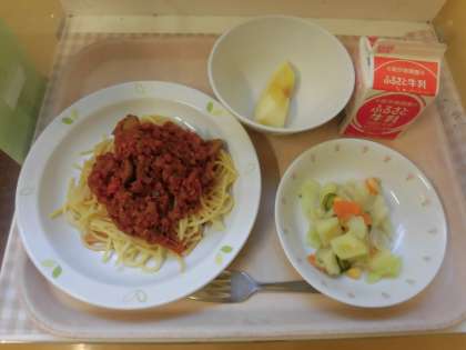 ☆今日の給食は「ミートソーススパゲティー」です。ミートソースも給食室で作られています。たくさんの玉葱や にんじん ピーマンをみじん切りにして、給食室の大釜でじっくり煮込み作られたソースです。スパゲティーに、ミートソースをかけてみんなで食べました。