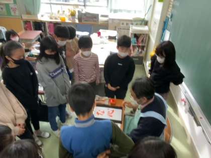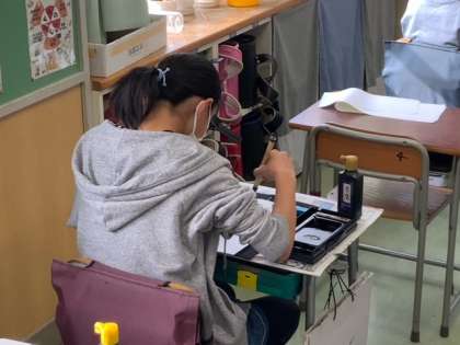 書写で「豊かな心」を書いていきます。今日は「な」「心」の書いていく上でのポイントを確認しています。