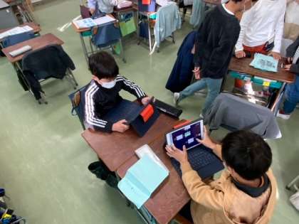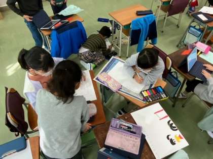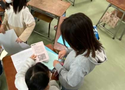 どきどきわくわく烏山で、仲間と調べた仙川の生き物や昔の学校などを協力してまとめていきます。