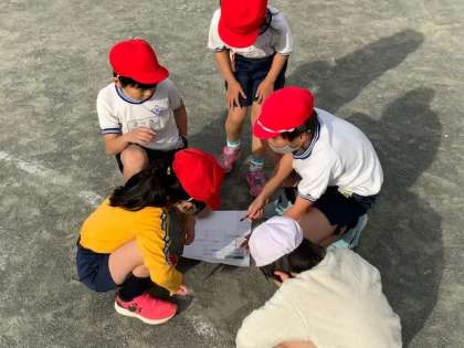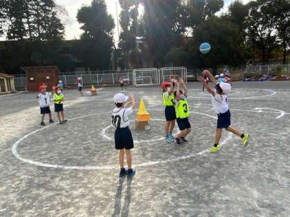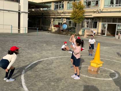 体育「ぐるぐるまと当てゲーム」です。3人が外からまとのコーンを目がけてボールを投げ、中の3人が当てられないように防御します。とても楽しみながらボール投げたり、とったりできています。