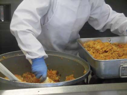 ☆今月の世界の料理は、アメリカ南部ルイジアナ州の料理です。今日のジャンバラヤですが、辛いスパイスを使うのが特徴です。少しスパイシーな所が特徴の料理ですが、今日は子ども達が食べやすいように作りました。