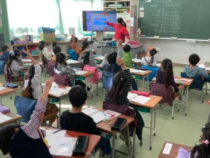 算数で比べ方の学習をしていきます。大型テレビに映されている木、シート、リス、なわとびなどの比べる言葉を確認しています。木は「ひくい、たかい」、シートは「ひろい、せまい」などです。