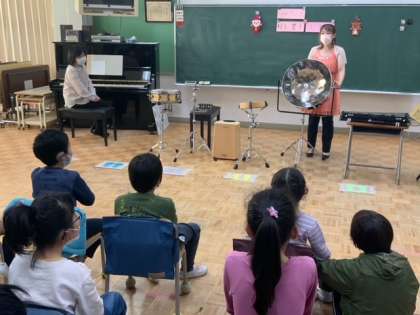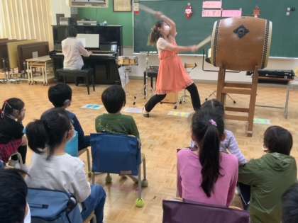 つくし学級で打楽器奏者によるコンサートを行いました。カホンやスチールドラムなど珍しい楽器も登場しました。陽気なリズムに合わせて手を叩いたり、体全体でのっている子どももいます。