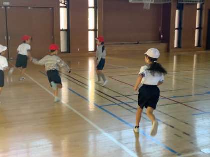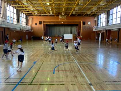 体育館体育で「こおり鬼」をして体をほぐします。たくさん走っていました。