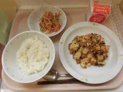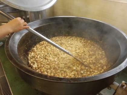 ☆今日は子ども達に人気の麻婆豆腐です。具だくさんで、たくさんの野菜も入っています。給食室の大釜でたくさん作りました。