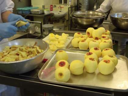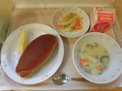 ☆今日の果物は青森県産のリンゴです。ヨーロッパのことわざに、1日1個のリンゴで医者いらず、とあるように昔からリンゴの成分が健康によいと知らされていました。今日も給食室でたくさんのりんごをむいて包丁でカットしています。