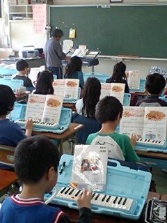 音楽の時間です。担任の先生のオルガン伴奏に合わせ、全員で「子ぎつね」を合奏しました。