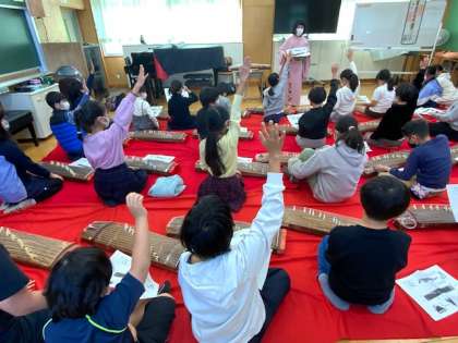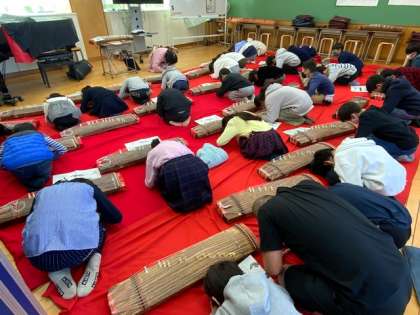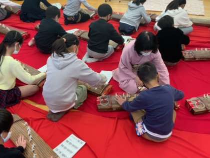 音楽で講師の先生をお招きして、お箏の体験学習を行いました。4年生全員を対象に2時間ずつ行い一人一面のお箏を用意されています。お箏の学習もですが、心を整えるお辞儀の仕方など日本人の心に触れる素晴らしい機会となりました。