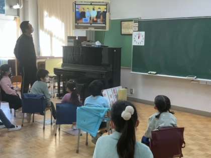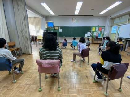 朝の放送集会で間違い探しゲームを行いました。2枚の絵や写真を見て変わったところを探します。