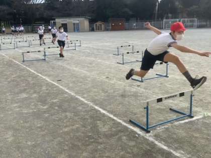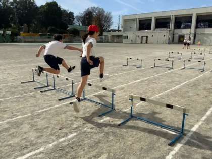 体育でハードル走に取り組んでいます。コースそれぞれのハードルの間隔が違い、自分に合うかどうか試しています。